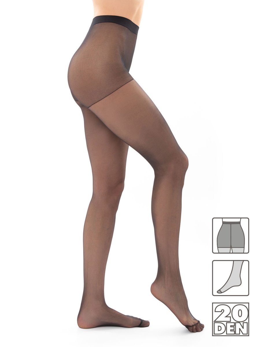 Media panty multifilamento, sin lycra. Tejida con hilado de 20 Deniers, se ve por completo la piel de la pierna y la sensación es de una media muy fina y transparente. Composición: 97% Poliamida/ 3% Elastano.