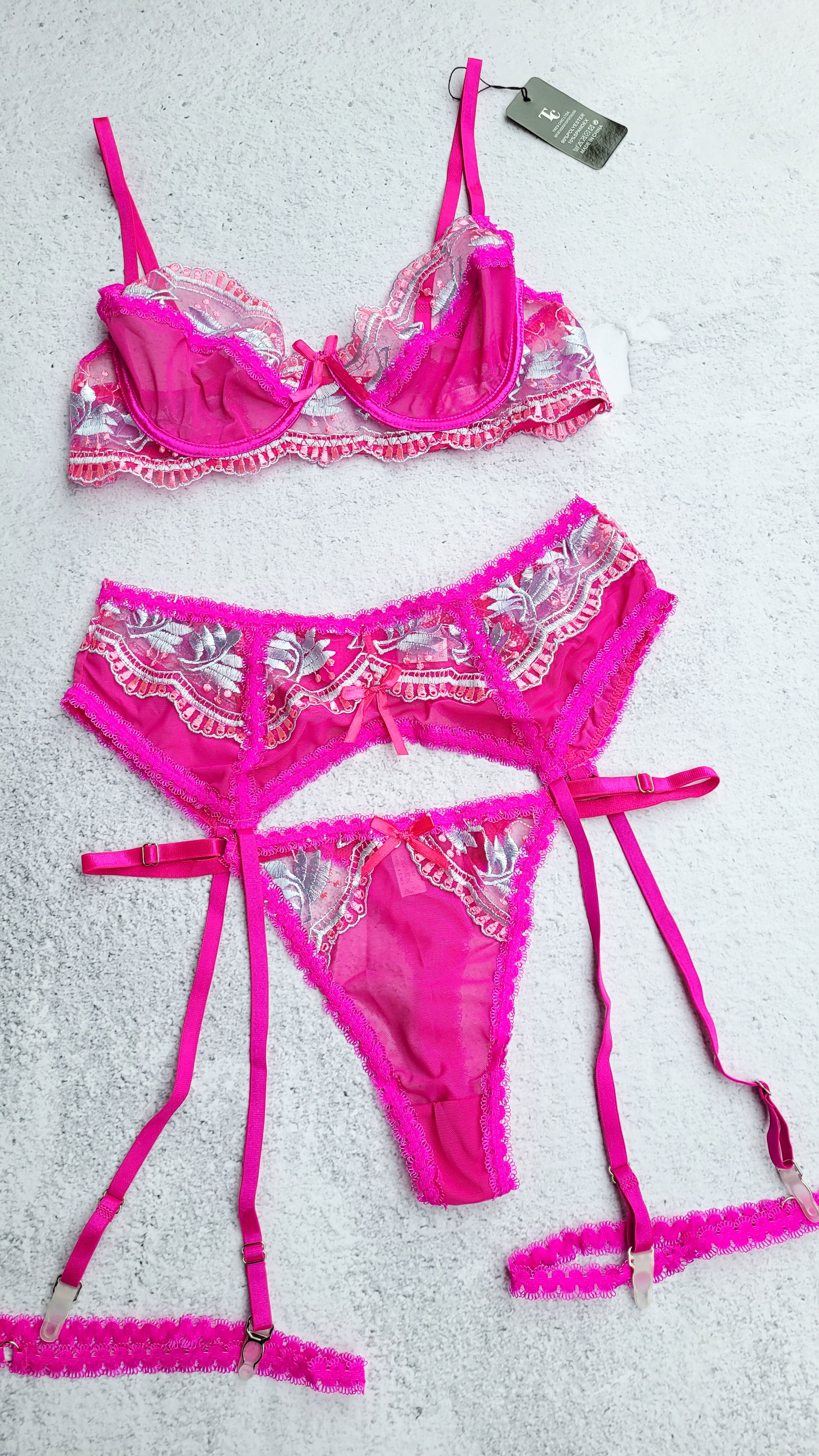 Conjunto con aros sin taza, espalda regulable. Less regulable y liguero con ganchos regulables en la espalda.